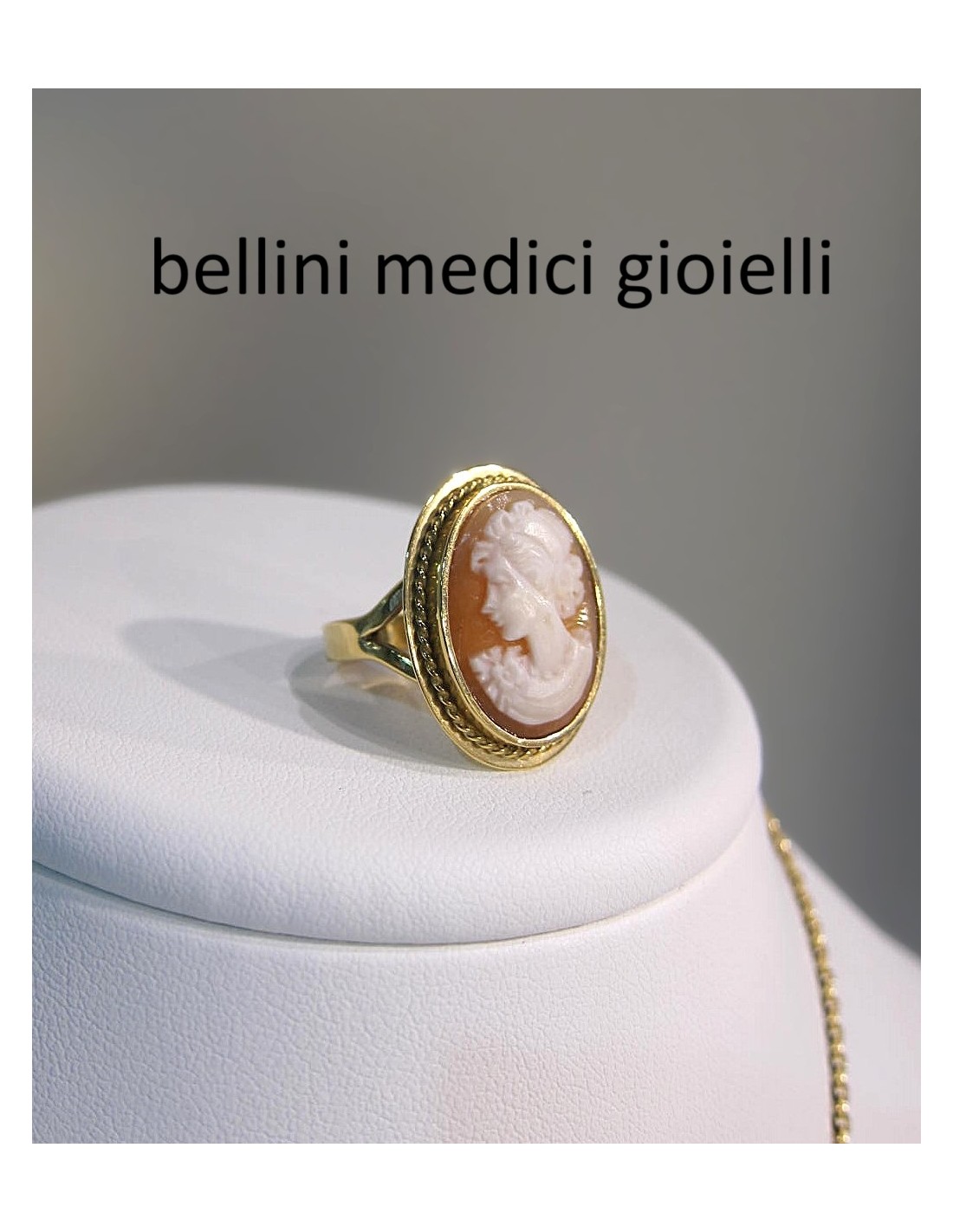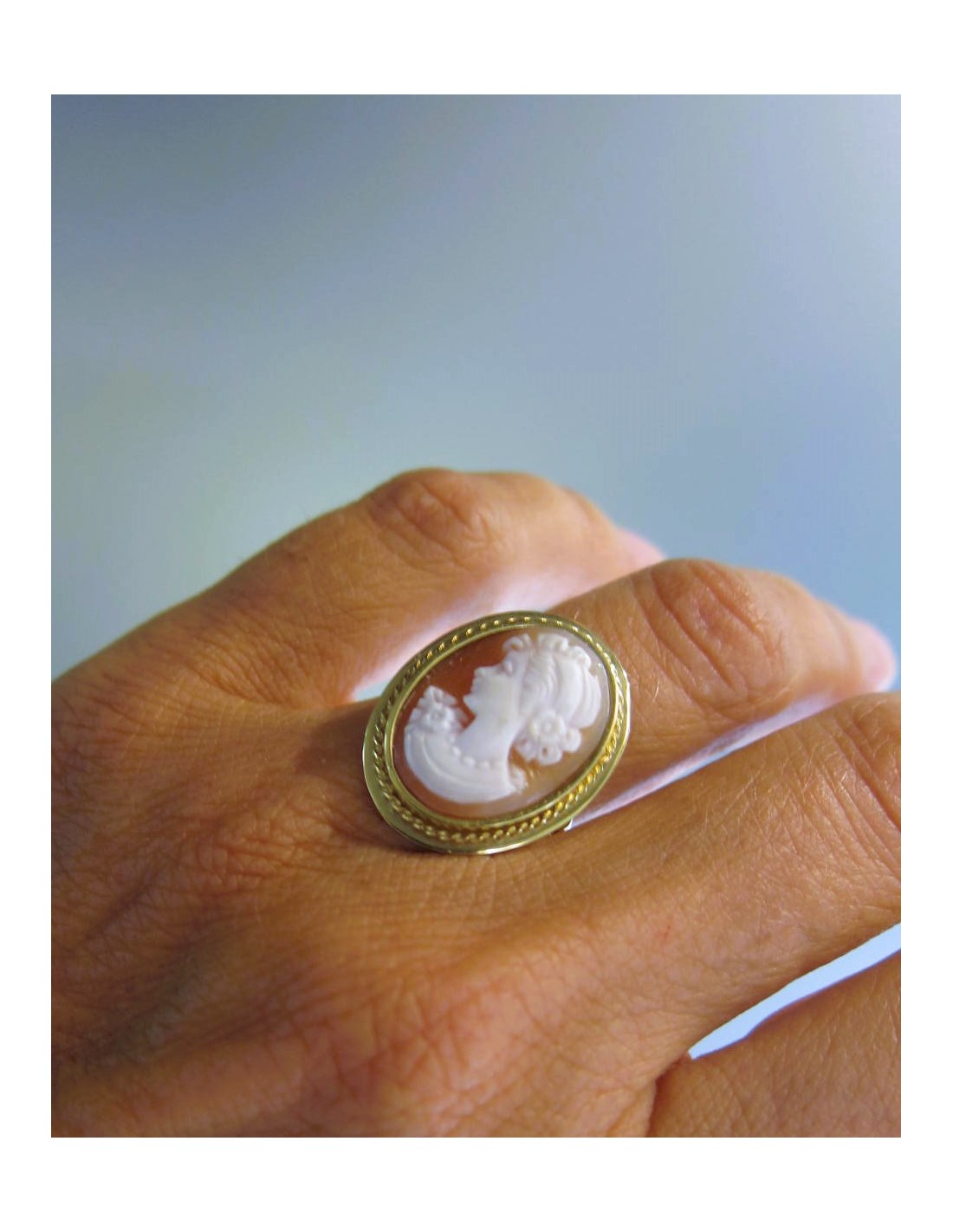 Anello in oro giallo con cammeo ovale su conchiglia