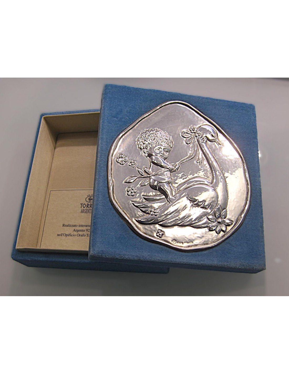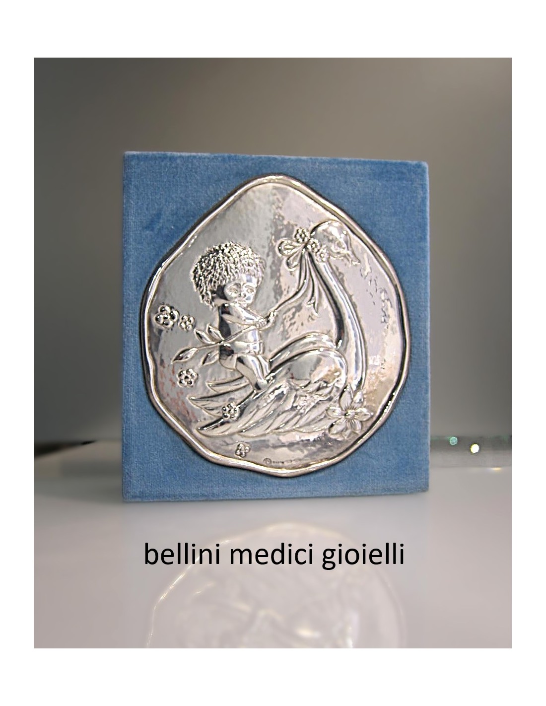 LA PIASTRA RAPPRESENTA LA NASCITA : UN PUTTINO CHE ARRIVA A CAVALLO DI UNA CICOGNA