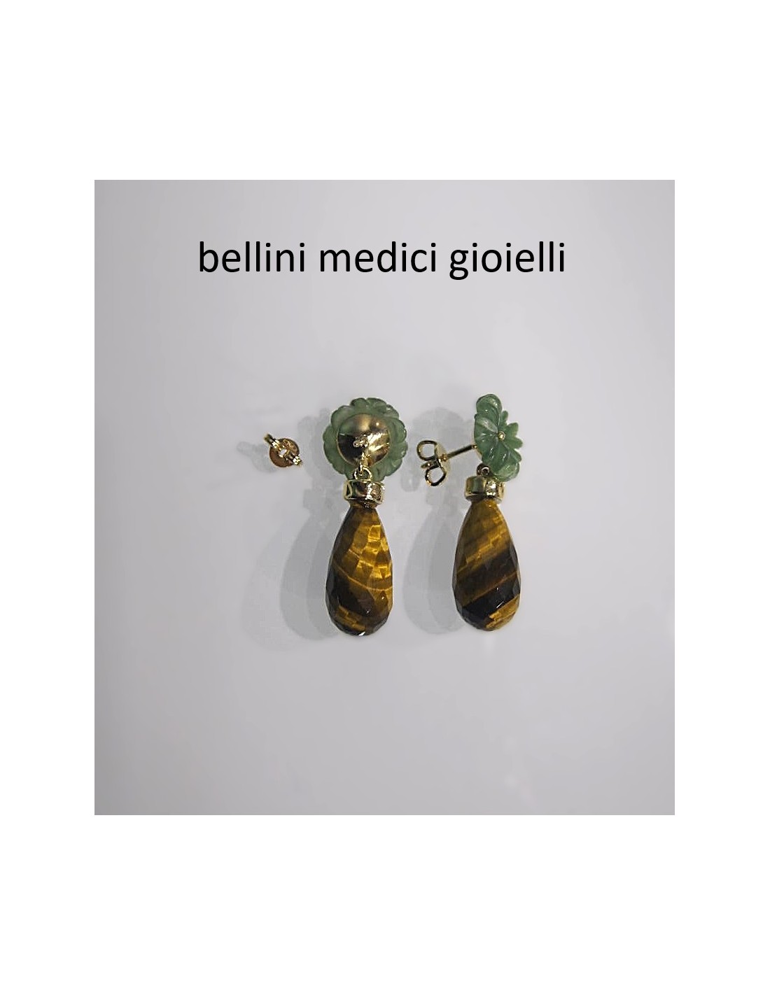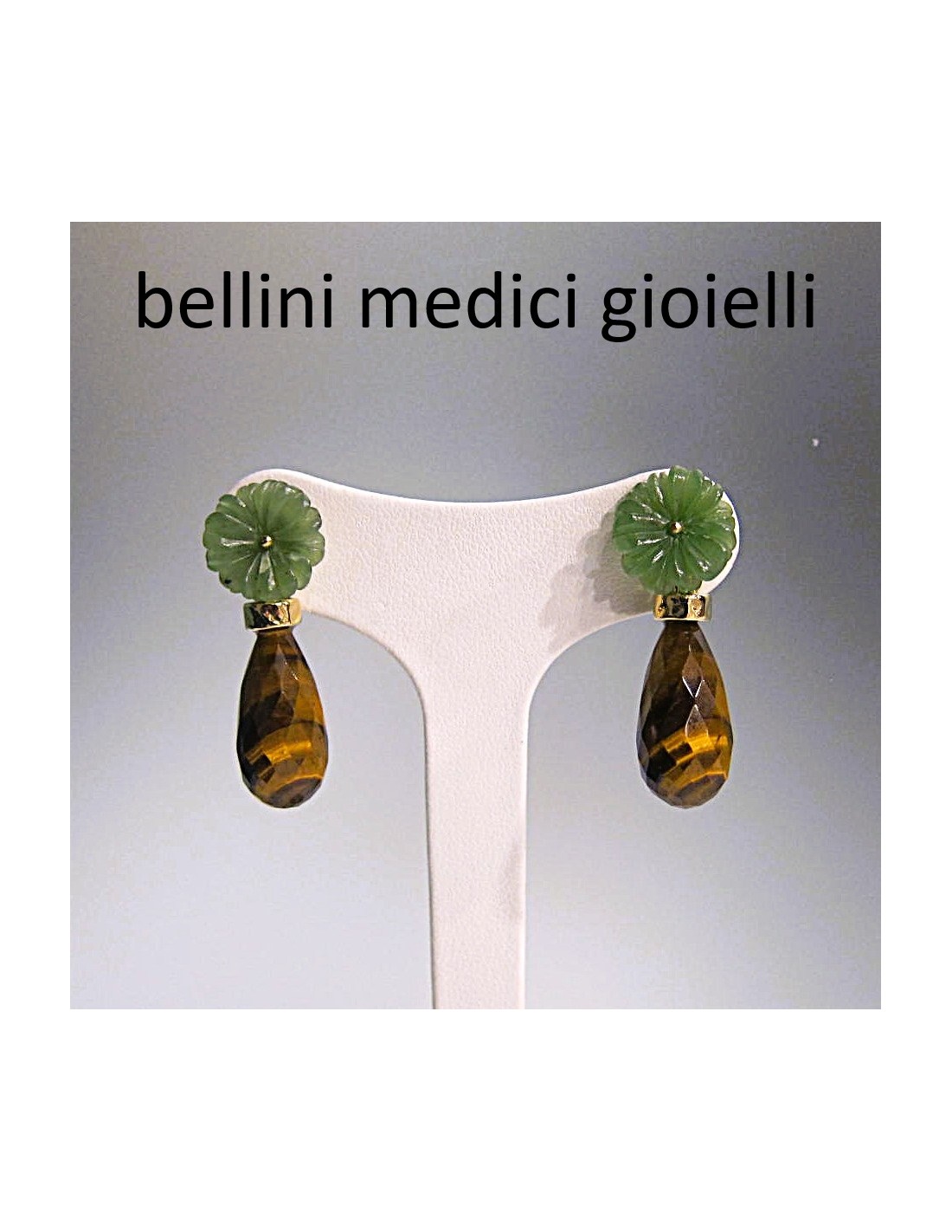 orecchini in oro giallo con con goccia di occhio di tigre e fiore in giada